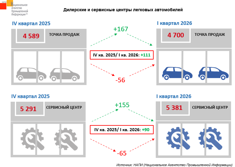Маркетинговое агентство НАПИ обновило отчет по дилерским и сервисным центрам легковых автомобилей по итогам 1 квартала 2026 года. По сравнению с 4 кварталом 2025 года количество авторизованных точек продаж выросло на 111 ед., а количество авторизованных сервисных центров увеличилось на 90 ед.