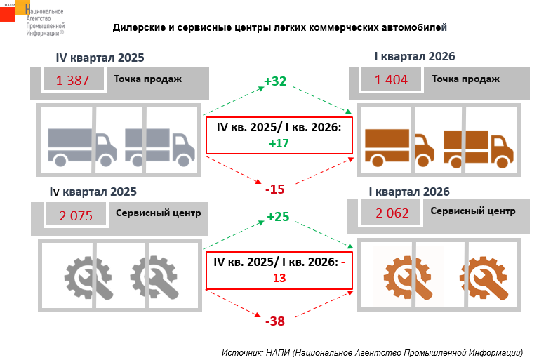 Маркетинговое агентство НАПИ обновило отчет по дилерским и сервисным центрам легких коммерческих автомобилей* в первом квартале 2026 года.