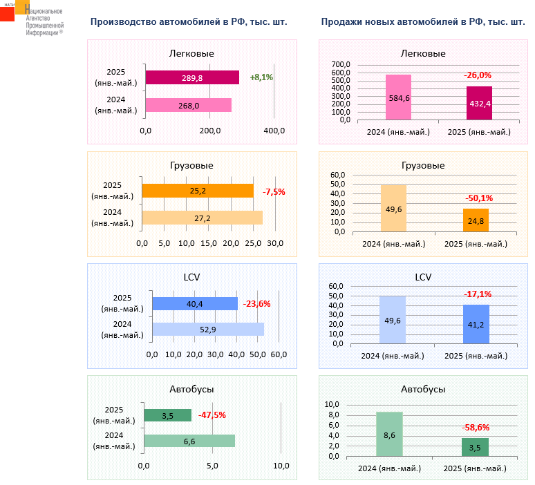Маркетинговое агентство НАПИ проанализировало данные по производству и продажам новых автомобилей в январе-мае 2025 г. В рассматриваемом периоде выросло только производство легковых автомобилей, но темпы роста снизились по сравнению с результатами января-апреля, +8,1% и + 12,2% соответственно. Выпуск коммерческой техники сократился. Производство грузовых автомобилей снизилось на 7,5%, по итогам четырех месяцев 2025 года снижение было не таким сильным (-6,8%). Рынок грузовых автомобилей по итогам января-мая упал на 50,1%. Выпуск автобусов в январе-мае текущего года тоже снизился не так сильно, как продажи новой техники. Производство же LCV* сократилось сильнее рынка.