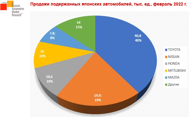 Наибольшим спросом в феврале 2022 г. пользовались японские подержанные автомобили, продажи которых составили 103 тыс. Доля японских автомобилей на рынке автомобилей с пробегом в феврале текущего года достигла 28,4%.