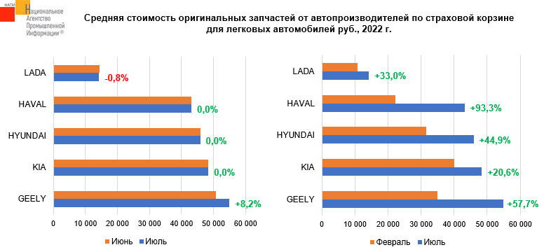 Маркетинговое агентство НАПИ (Национальное Агентство Промышленной Информации) проанализировало цены на оригинальные запчасти от автопроизводителей по страховой корзине для легковых автомобилей. Интересно отметить, что из представленных на графике наиболее популярных брендов, средние цены на запчасти в июле относительно июня слегка снизились только для автомобилей Lada. Средние цены на запчасти для Geely выросли на 8,2% и практически вернулись к майскому уровню. Цены на запчасти для остальных автомобилей в июле относительно июня не изменились. По сравнению же с февралем средние цены на запчасти по страховой корзине существенно выросли у всех брендов.