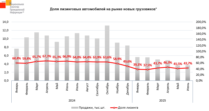 По данным маркетингового агентства НАПИ, за январь-июнь 2025 года в финансовый лизинг было выдано 11,9 тыс. новых грузовых автомобилей*, что на 69,3% меньше, чем за аналогичный период 2024 года, когда в лизинг было поставлено 38,8 тыс. новых грузовиков. Снижение продаж новой грузовой техники было менее существенным – на 52,7%. По итогам первого полугодия 2025 года доля лизинговых грузовых автомобилей сократилась в полтора раза до 41,7%. Самыми худшими месяцами стали январь и февраль текущего года, когда доля лизинга упала до 39,1% и 37,5% соответственно. В период с марта по июнь ситуация стабилизировалась, доля лизинга сохранялась на уровне 41,5%-46,3%.