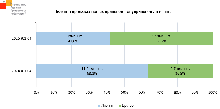 Рынок новой прицепной техники в январе-апреле 2025 года сократился не так сильно - на 49,2%. В результате доля лизинговых прицепов-полуприцепов снизилась на 21,3 п.п.