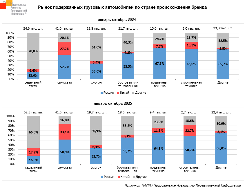 По данным маркетингового агентства НАПИ, за январь-октябрь 2025 года было продано 166,8 тыс. единиц подержанных грузовых автомобилей*, что на 5,7% меньше, чем годом ранее, когда было реализовано 176,9 тыс. грузовиков. Продажи подержанной российской техники за год снизились на 7,1% до 69,0 тыс. ед. Продажи подержанных китайских грузовиков, напротив, выросли на 47,6% до 27,6 тыс. шт. За год доля подержанной российской техники сократилась на 0,7 п.п. до 41,3%, а доля китайской увеличилась на 5,9 п.п. до 16,5%. Больше всего доля российских грузовиков сократилась в сегменте строительной техники (-7.3 п.п.), но выросла в сегменте седельных тягачей (+0,7 п.п.) При этом доля китайских грузовиков выросла во всех сегментах, значительнее всего она увеличилась в сегменте седельных тягачей (+10,8 п.п.)