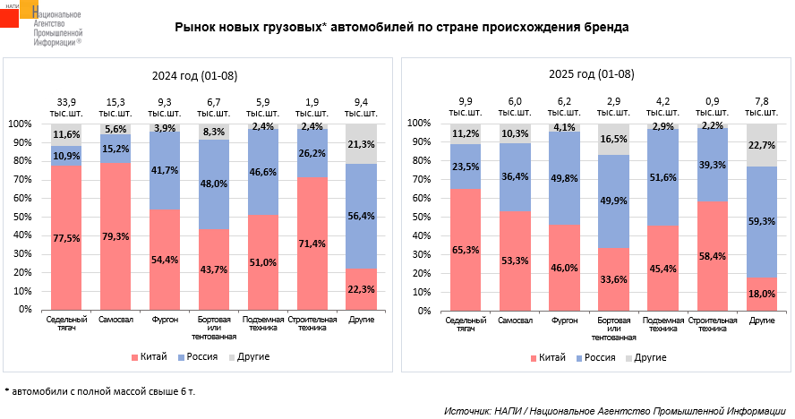 За восемь месяцев текущего года, сильнее всего сократилась доля китайской техники в сегментах самосвалов (-26 п.п.), строительной техники (-13 п.п.) и седельных тягачей (-12,2 п.п).