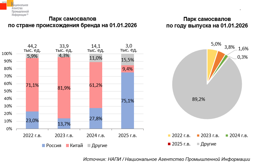 По данным маркетингового агентства НАПИ, в парке самосвалов на 01.01.2026 насчитывается 886,9 тыс. ед. техники.