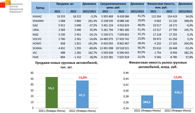 По данным маркетингового агентства НАПИ (Национальное Агентство Промышленной Информации) за 7 месяцев текущего года на покупку новых грузовых автомобилей было потрачено 436, 2 млрд. руб. Несмотря на снижение продаж «в штуках» по сравнению с январем-июлем прошлого года на 11%, емкость рынка новых грузовых автомобилей выросла на 13,4% за счет существенного роста цен. За семь месяцев прошлого года средневзвешенная цена нового грузовика составила 7,2 млн. руб. , в текущем году – 9,2 млн. руб. Лидерами по темпам роста продаж в «штуках» и «деньгах» стали китайские грузовики.