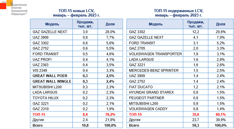 По данным маркетингового агентства НАПИ, продажи подержанных LCV (техника с полной массой до 6 т) по итогам двух месяцев 2023 года выросли на 8,6%, так в январе-феврале текущего года было продано 59,3 тыс. подержанных автомобилей против 54,6 тыс. годом ранее.