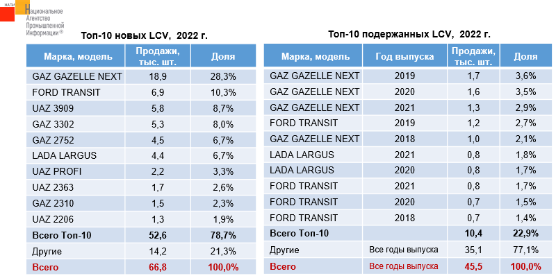 По данным маркетингового агентства НАПИ, в 2022 г. корпоративные клиенты приобрели 112,3 тыс. новых и подержанных легких коммерческих автомобилей. На долю новой техники пришлось 59,5% или 66,8 тыс. штук, на долю подержанной – 40,5% или 45,5 тыс. Интересно отметить, что несмотря на уход с российского рынка, FORD TRANSIT занял второе место в структуре продаж новых автомобилей. Что касается рынка подержанной техники, то в десятку лидеров вошли достаточно «свежие» автомобили, возрастом до 5 лет. Подержанные автомобили FORD TRANSIT также пользуются хорошим спросом у корпоративных клиентов.