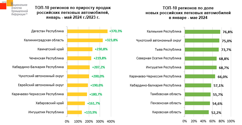 По данным маркетингового агентства НАПИ, в январе-мае 2024 года продажи новых российских легковых автомобилей выросли на 63%. В 35 регионах темпы прироста были еще выше, лидировала по этому показателю Республика Дагестан (+370,3%). Доля российских легковых автомобилей на рынке снизилась до 32,4% с 37% по итогам пяти месяцев прошлого года. Лидером по доле российских автомобилей по итогам пяти месяцев 2024 года стала Республика Калмыкия, где чуть более трех четвертей рынка заняли российские марки.