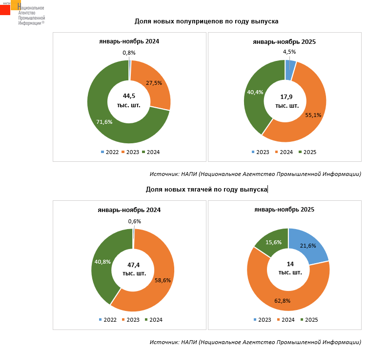 Маркетинговое агентство НАПИ проанализировало продажи новых и подержанных полуприцепов, новых седельных тягачей в январе-ноябре 2025 года.