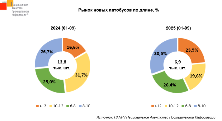 По данным маркетингового агентства НАПИ, за январь-сентябрь 2025 года было продано 6,9 тыс. ед. новых автобусов, что на 50,1% меньше, чем годом ранее, когда было реализовано 13,8 тыс. автобусов.