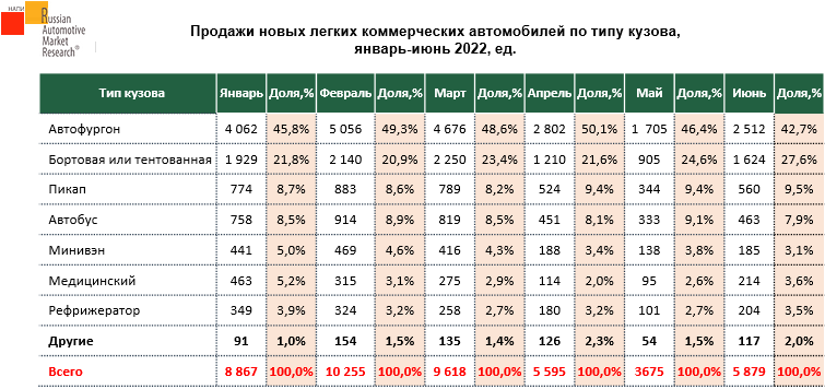 В мае-июне доля фургонов снижалась, в июне фургоны заняли всего 42,7% рынка.