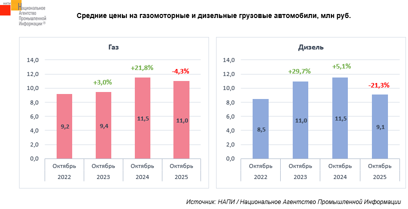 Маркетинговое агентство НАПИ проанализировало динамику средних цен на новые газомоторные и дизельные грузовые* автомобили. Больше всего стоимость дизельных грузовиков выросла в 2023 году, в октябре она увеличилась на 29,7%. Стоимость газовых грузовиков выросла на 21,8% в октябре годом позже. При этом дизельные грузовики в октябре 2024 года подросли в цене только на 5,1%. В октябре 2025 года стоимость грузовых автомобилей снизилась: цена на газовые грузовики сократилась на 4,3% до 11 млн рублей, а на дизельные – на 21,3% до 9,1 млн рублей.