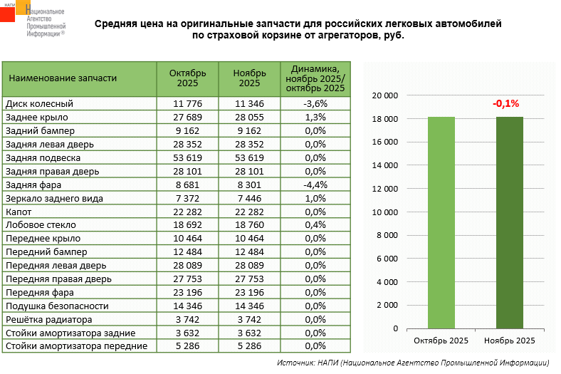 За месяц, с октября по ноябрь 2025 года, средняя цена на оригинальные запчасти сократилась на 0,1%. Так, снизилась стоимость задней фары (-4,4%) и колесного диска (-3,6%). При этом выросли в цене заднее крыло (+1,3%), зеркало заднего вида (+1%) и лобовое стекло (+0,4%).