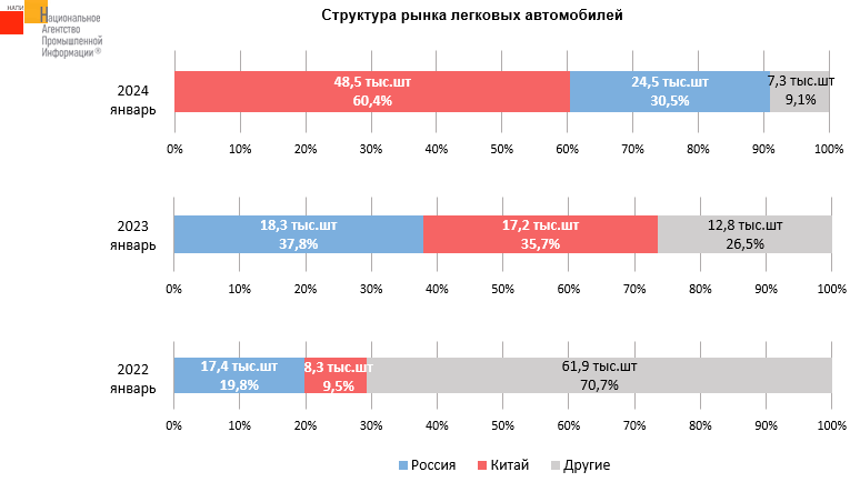 По данным маркетингового агентства НАПИ, доля китайских брендов на рынке новых легковых автомобилей в январе 2024 года достигла 60,4%, было продано 48,5 тыс. китайских автомобилей. На долю российских брендов пришлось 30,5% или 24,5 тыс. шт. В январе 2022 года, до массового ухода большинства иномарок, доля «китайцев» не дотянула и до 10%, было продано 8,3 тыс. китайских автомобилей. В январе 2023 и январе 2024 года китайские бренды наращивали и долю на рынке, и продажи. Что касается российских брендов, то продажи автомобилей росли и в январе 2023, и в январе 2024 года, но доля в январе текущего года сократилась по сравнению с январем 2023 года за счет бурного роста продаж китайских автомобилей (+182% к январю 2023).