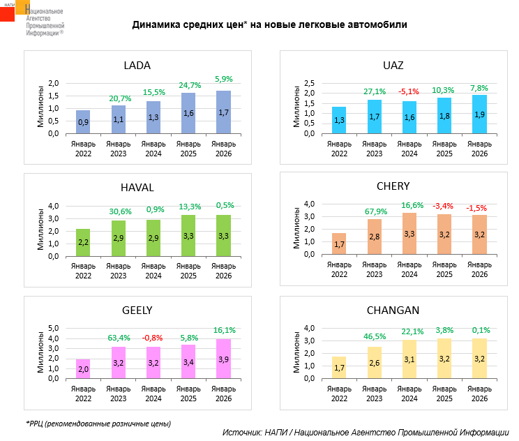 Маркетинговое агентство НАПИ проанализировало динамику средних цен* на новые легковые автомобили в январе 2022-2026 годов. Для анализа были выбраны российские марки LADA и UAZ, а также наиболее продаваемые в 2025 году китайские марки CHANGAN, CHERY, GEELY и HAVAL.