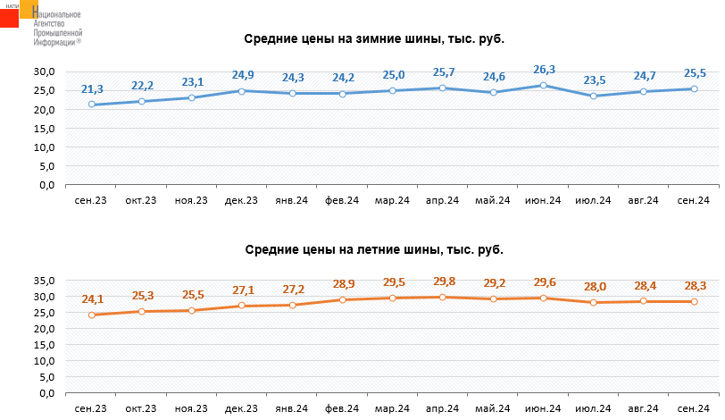 Маркетинговое агентство НАПИ проанализировало динамику средних цен на новые шины премиального ценового сегмента для легковых автомобилей с сентября 2023 по сентябрь 2024 года. За год средняя цена на зимние шины выросла на 20,0%, летние шины подорожали на 17,4%.