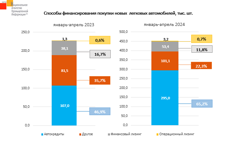 Маркетинговое агентство НАПИ проанализировало способы финансирования покупки новых легковых автомобилей. Самым популярным способом остается автокредит. По итогам четырех месяцев 2024 года доля купленных с помощью автокредита автомобилей увеличилась до 65,2%. В финансовый лизинг было приобретено 11,8% автомобилей, в операционный лизинг – 0,7%.