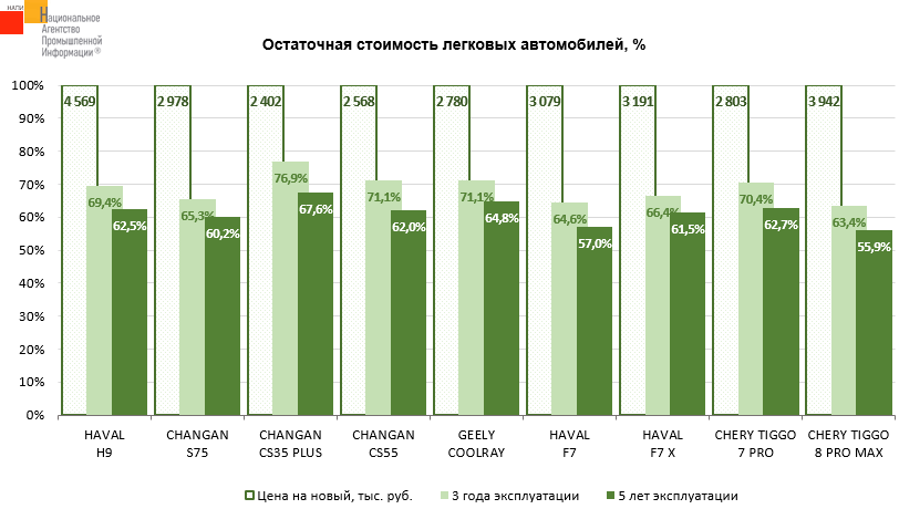 Маркетинговое агентство НАПИ (Национальное Агентство Промышленной Информации) обновило отчет «Остаточная стоимость легковых автомобилей» по итогам 3 квартала 2024 г. Среди представленных на графике легковых автомобилей лидером по сохранности остаточной стоимости через 3 года и 5 лет эксплуатации стал CHANGAN CS35 PLUS. Так, продав трехлетний автомобиль, владелец мог приобрести новый CHANGAN CS35 PLUS, доплатив всего 23,1% от его цены в 3 квартале 2024 г. Через 5 лет эксплуатации владелец мог приобрести новый CHANGAN CS35 PLUS, доплатив 32,4% от его цены в 3 квартале 2024 г.