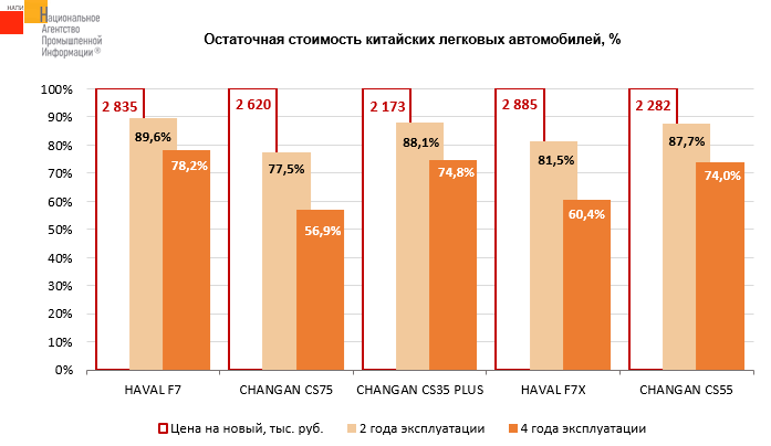 Маркетинговое агентство НАПИ (Национальное Агентство Промышленной Информации) обновило отчет «Остаточная стоимость легковых автомобилей» по итогам 4 квартала 2023 г. Среди представленных на графике китайских легковых автомобилей лидером по сохранности остаточной стоимости через 2 и 4 года эксплуатации стал HAVAL F7, который сохранил 89,6% и 78,2% от цены соответственно.