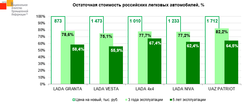 Маркетинговое агентство НАПИ (Национальное Агентство Промышленной Информации) обновило отчет «Остаточная стоимость легковых автомобилей» по итогам 3 квартала 2023 г. Среди представленных на графике российских легковых автомобилей лидером по сохранности остаточной стоимости через 3 года эксплуатации стал UAZ PATRIOT, который сохранил 82,2% от цены, через 5 лет эксплуатации лидирует LADA 4X4 с результатом 67,4%.