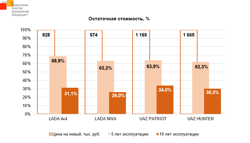 Маркетинговое агентство НАПИ обновило отчет «Потеря стоимости легковых автомобилей возрастом до 10 лет» по итогам 2 квартала 2023 г. Среди представленных на графике российских автомобилей сегмента SUV, продаваемых в текущем году, через 5 лет эксплуатации лидирует по сохранности остаточной стоимости LADA 4x4, который сохраняет 68,9% от цены. Через 10 лет эксплуатации лидирует UAZ PATRIOT с результатом 34,0%.