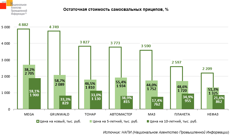 Лидером по сохранности остаточной стоимости по отношению к цене нового самосвального прицепа через 5 лет эксплуатации стал прицеп «ПЛАНЕТА». Продав пятилетний прицеп, владелец мог приобрести новый прицеп «ПЛАНЕТА», доплатив 33,8% от его цены в 4 квартале прошлого года. Через 10 лет эксплуатации лучшим по сохранности остаточной стоимости по отношению к цене нового прицепа стал «НЕФАЗ». Продав десятилетний прицеп, владелец мог приобрести новый «НЕФАЗ», доплатив 61% от его цены в прошлом квартале.