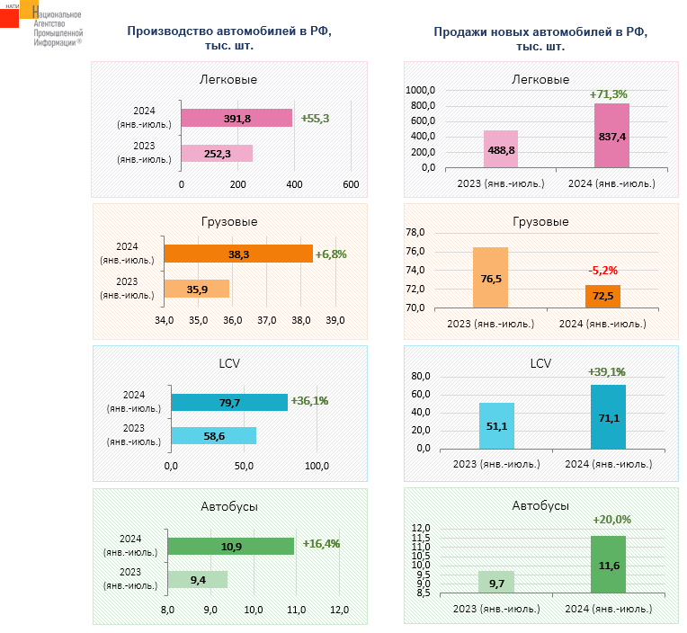 Маркетинговое агентство НАПИ проанализировало данные по производству и продажам новых автомобилей в январе-июле 2024 г. Наибольшими темпами росло производство легковых автомобилей (+55,3%), хотя рост рынка был еще более впечатляющим (+71,3%). Меньше всего выросло производство грузовиков (+6,8%), но продажи грузовой техники за этот же период снизились на 5,2%.