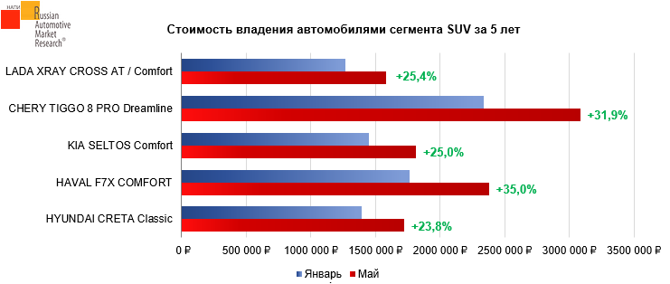 Из рассматриваемых на графике моделей SUV лидерами по росту стоимости владения с января по май стали китайские автомобили HAVAL F7X COMFORT (+35,0%) и CHERY TIGGO 8 PRO Dreamline (+31,9%).