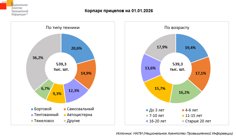По данным маркетингового агентства НАПИ, в корпоративном парке прицепов и полуприцепов на 01.01.2026 года насчитывается 539,3 тыс. единиц техники.