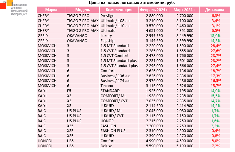 Снизились цены на ряд комплектаций CHERY, MOSKVICH, BAIC, HONGQI, всего подешевело 17 комплектаций. Снижение цен составило от 0,4% до 28,7%. Цены на 10 комплектаций GEELY, KAIYI, BAIC в марте выросли. Рост цен составил от 1,6% до 15,5%.