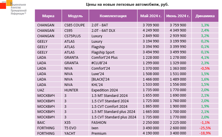 Маркетинговое агентство НАПИ проанализировало рекомендованные розничные цены (РРЦ) на новые легковые автомобили в июне 2024 г. По сравнению с маем 2024 г. изменились цены на 21 комплектацию. Снизились цены на 4 комплектации марок LADA, BAIC, FORTHING. Снижение цен составило от 0,5% до 25,5%. Цены на 17 комплектаций марок CHANGAN, GEELY, LADA, UAZ, МОСКВИЧ в июне выросли. Рост цен составил от 0,1% до 4,1%.