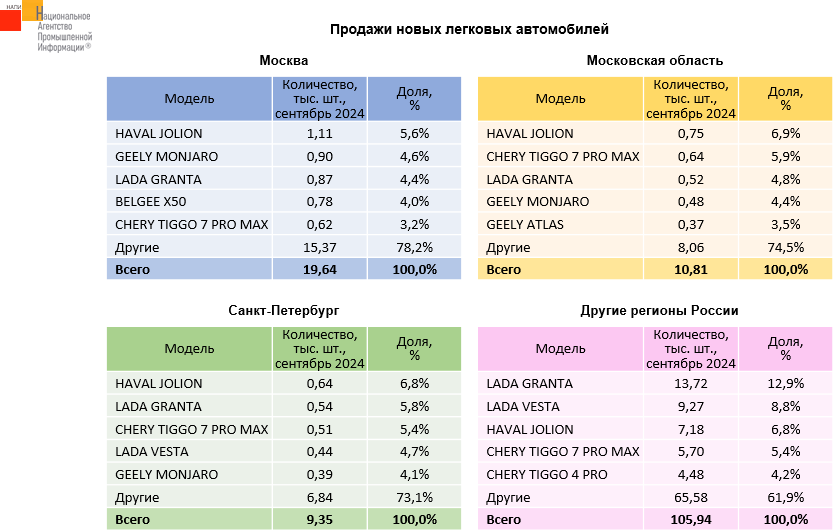 Маркетинговое агентства НАПИ проанализировало региональные предпочтения покупателей новых легковых автомобилей в сентябре 2024 года. Так в Москве, Московской области, Санкт-Петербурге самым продаваемым автомобилем стал HAVAL JOLION, его доля на этих региональных рынках варьируется от 5,6% до 6,9% . В остальных регионах России покупатели в первую очередь выбирали LADA GRANTA, доля этого автомобиля почти в 2 раза превосходит долю HAVAL JOLION.