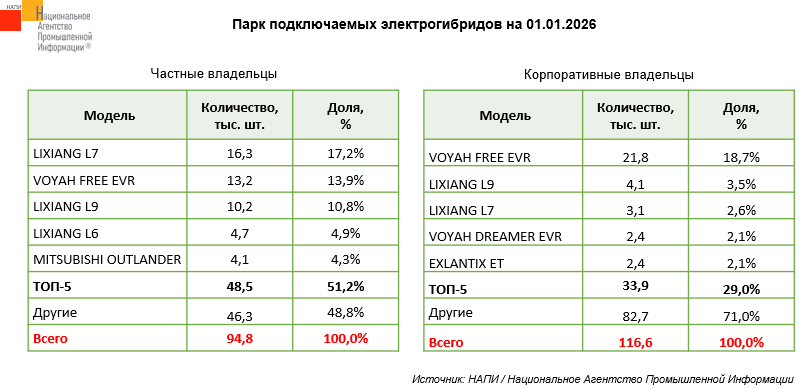 По данным маркетингового агентства НАПИ, в парке подключаемых электрогибридов на 01.01.2026 насчитывается 116,6 тыс. ед. автомобилей. Из них 94,8 тыс. принадлежат частным владельцам, а 21,8 тыс. – корпоративным.