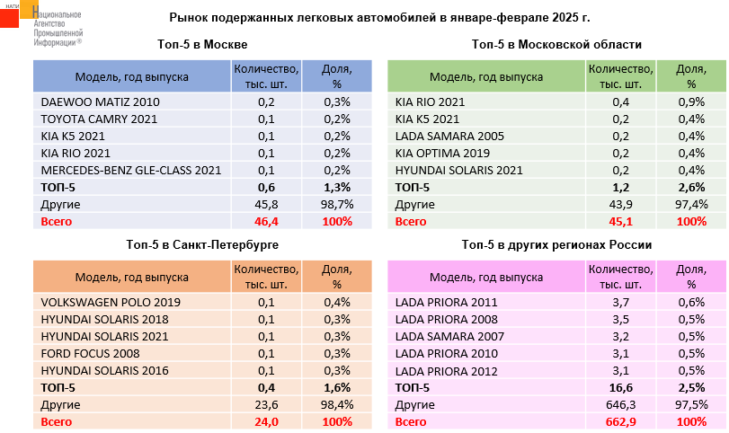 Маркетинговое агентство НАПИ проанализировало какие подержанные автомобили пользовались наибольшим спросом в различных регионах России в январе-феврале 2025 года. Так в пятерку лидеров в Москве не вошел ни один российский автомобиль, но вошел четырехлетний MERCEDES-BENZ GLE-CLASS. Кроме того, москвичи охотно покупают «свежие» автомобили, так в пятерке лидеров - четыре четырехлетних автомобиля. В Московской области в пятерку лидеров вошел один российский автомобиль – двадцатилетняя LADA SAMARA, четырехлетних автомобилей – всего три. В Санкт-Петербурге в пятерке лидеров, как и в Москве, нет ни одного российского автомобиля, только один четырехлетний автомобиль попал в Топ-5 - HYUNDAI SOLARIS. В остальных регионах России лучше всего покупают «возрастные» российские автомобили. В пятерку лидеров не вошла ни одна иномарка, самому «молодому» автомобилю - тринадцать лет.