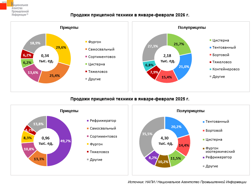 По данным маркетингового агентства НАПИ, за январь-февраль 2026 года было продано 2,18 тыс. ед. новых полуприцепов, что на 49,3% меньше, чем годом ранее. Продажи новых прицепов составили 0,34 тыс. ед., за год сократившись на 64,6%.