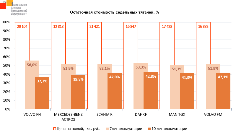 Маркетинговое агентство НАПИ (Национальное Агентство Промышленной Информации) обновило отчет «Остаточная стоимость грузовых автомобилей» по итогам 2 квартала 2024 г. Среди представленных на графике иностранных тягачей лидером по сохранности остаточной стоимости через 7 лет эксплуатации стал VOLVO FH. Так, продав семилетний тягач, владелец мог приобрести новый VOLVO FH, доплатив 44,0% от его цены во 2 квартале 2024 г. Через 10 лет эксплуатации лидировал DAF XF, продав который, владелец мог приобрести новый DAF XF, доплатив 57,2% от его цены во 2 квартале 2024 г.