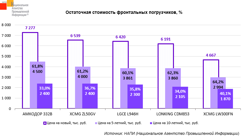 XCMG LW300FN стал лидером по сохранности остаточной стоимости по отношению к цене нового погрузчика через 5 лет и 10 лет эксплуатации. Продав пятилетний фронтальный погрузчик, владелец мог приобрести новый XCMG LW300FN, доплатив 35,8% от его цены в 4 квартале прошлого года. Продав десятилетний XCMG LW300FN, владелец мог приобрести новый, доплатив 59,9% от его цены в прошлом квартале.