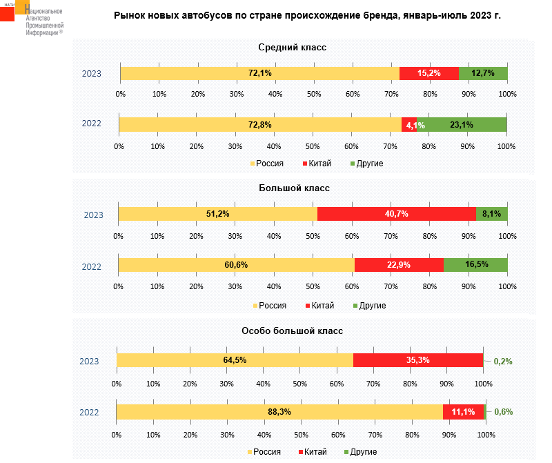 Маркетинговое агентство НАПИ проанализировало долю китайских автобусов в России. По итогам семи месяцев текущего года китайская техника заняла 20% в структуре продаж новых автобусов. За год доля китайских брендов выросла на 12%.