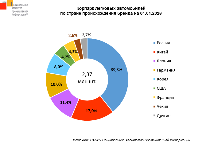 По данным маркетингового агентства НАПИ, в корпоративном парке легковых автомобилей на 01.01.2026 года насчитывается 2,4 млн единиц техники.