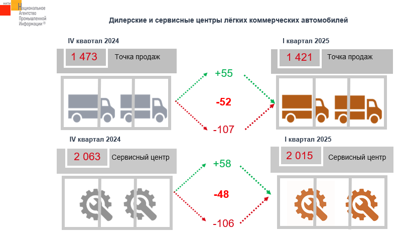 Маркетинговое агентство НАПИ обновило отчет по дилерам лёгких коммерческих автомобилей (LCV*) по итогам 1 квартала 2025 года. По сравнению с 4 кварталом 2024 года, количество авторизованных точек продаж сократилось на 52 ед. Количество авторизованных сервисных центров уменьшилось на 48 ед.