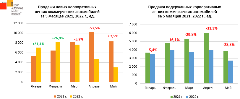 Согласно данным НАПИ (Национальное Агентство Промышленной Информации) всего за первые пять месяцев 2022 г. было продано 30,6 тыс. новых корпоративных легких коммерческих автомобилей, что на 20,3% меньше по сравнению с аналогичным периодом 2021 года, когда было реализовано 38,4 тыс. ед. Самое большое падение продаж произошло в мае 2022 года (-63,5%).