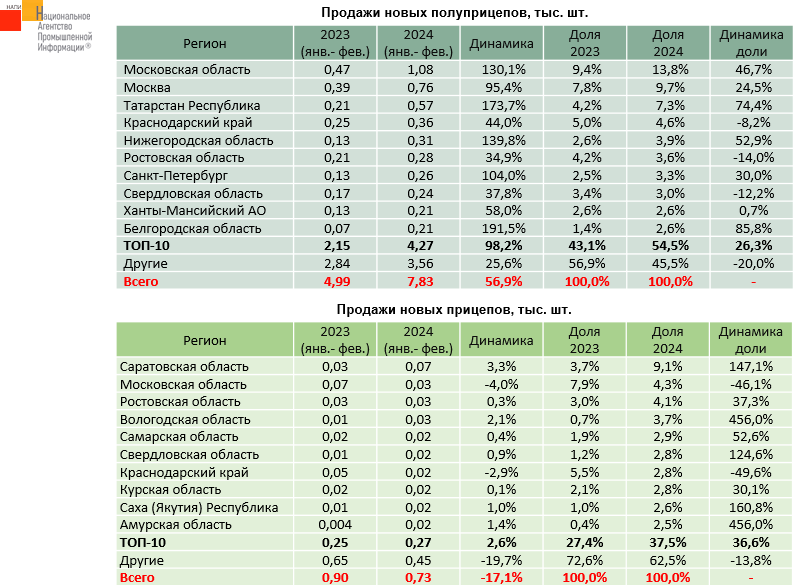 По данным маркетингового агентства НАПИ, продажи новых полуприцепов в январе-феврале 2024 года выросли на 56,9%. На долю десяти лидирующих регионов пришлось больше половины всех продаж. Самым крупным региональным рынком для полуприцепов стала Московская область, где было продано 1,08 тыс. новых полуприцепов. Рынок новых прицепов за первые два месяца текущего года сократился на 17,1%. Самым крупным региональным рынком для прицепов стала Самарская область.