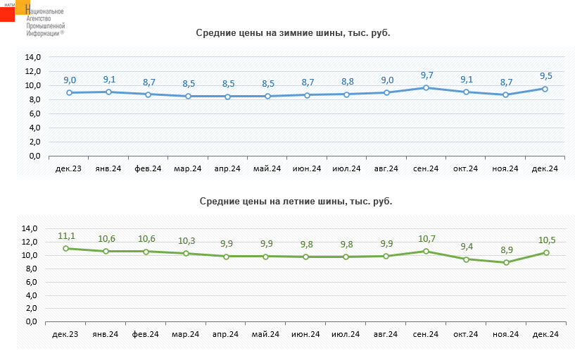 Маркетинговое агентство НАПИ проанализировало динамику средних цен на новые шины не премиального ценового сегмента для легковых автомобилей. За один месяц , с ноября 2024 по декабрь 2024 года, зимние шины подорожали на 9,2%, летние шины – на 16,9%. Такое резкое изменение цен могло быть следствием ноябрьского падения курса рубля к юаню, доллару, евро.