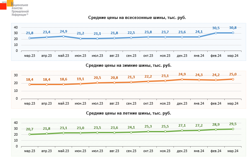 Маркетинговое агентство НАПИ проанализировало динамику средних цен на новые шины премиального ценового сегмента для легковых автомобилей с марта 2023 г. по март 2024 г. За год больше всего подорожали летние шины (+42,5%). На втором месте по росту цен – всесезонные шины (+41,2%). Зимние шины подорожали «всего лишь» на 36,2%.