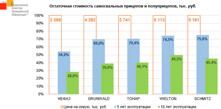 Согласно прогнозу НАПИ, среди представленных на графике самосвальных прицепов и полуприцепов через 5 лет лидером по сохранности остаточной стоимости является SCHMITZ, который сохраняет от своей первоначальной стоимости 75,0%. Через 10 лет по сохранности остаточной стоимости лидирует WIELTON, который сохраняет 49,5% от своей первоначальной стоимости.