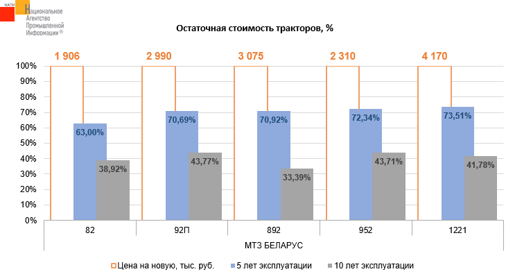 Согласно прогнозу НАПИ, среди представленных на графике тракторов марки МТЗ БЕЛАРУС через 5 лет лидером по сохранности остаточной стоимости является модель 1221, который сохраняет от своей первоначальной стоимости 73,5%. Через 10 лет по сохранности остаточной стоимости лидирует модель 95П, который сохраняет 43,8% от своей первоначальной стоимости.