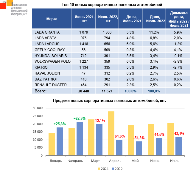 В июле 2022 г. снижение продаж корпоративным клиентам составило уже 43,1%. Тем не менее 3 модели из ТОР-10 сумели нарастить продажи в июле текущего года: LADA GRANTA (+21%), GEELY COOLRAY (+808,9%) и HAVAL JOLION (+563,8%).