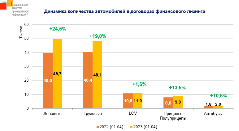 По данным маркетингового агентства НАПИ, за четыре месяца 2023 г. в финансовый лизинг было выдано 119,8 тыс. автомобилей всех типов, что на 18,7% больше, чем годом ранее. В январе-апреле 2022 г. было выдано 100,9 тыс. автомобилей всех типов. На долю легковых и грузовых автомобилей по итогам четырех месяцев 2023 г. пришлось 41,5% и 40,1% соответственно от всех выданных в финансовый лизинг автомобилей.